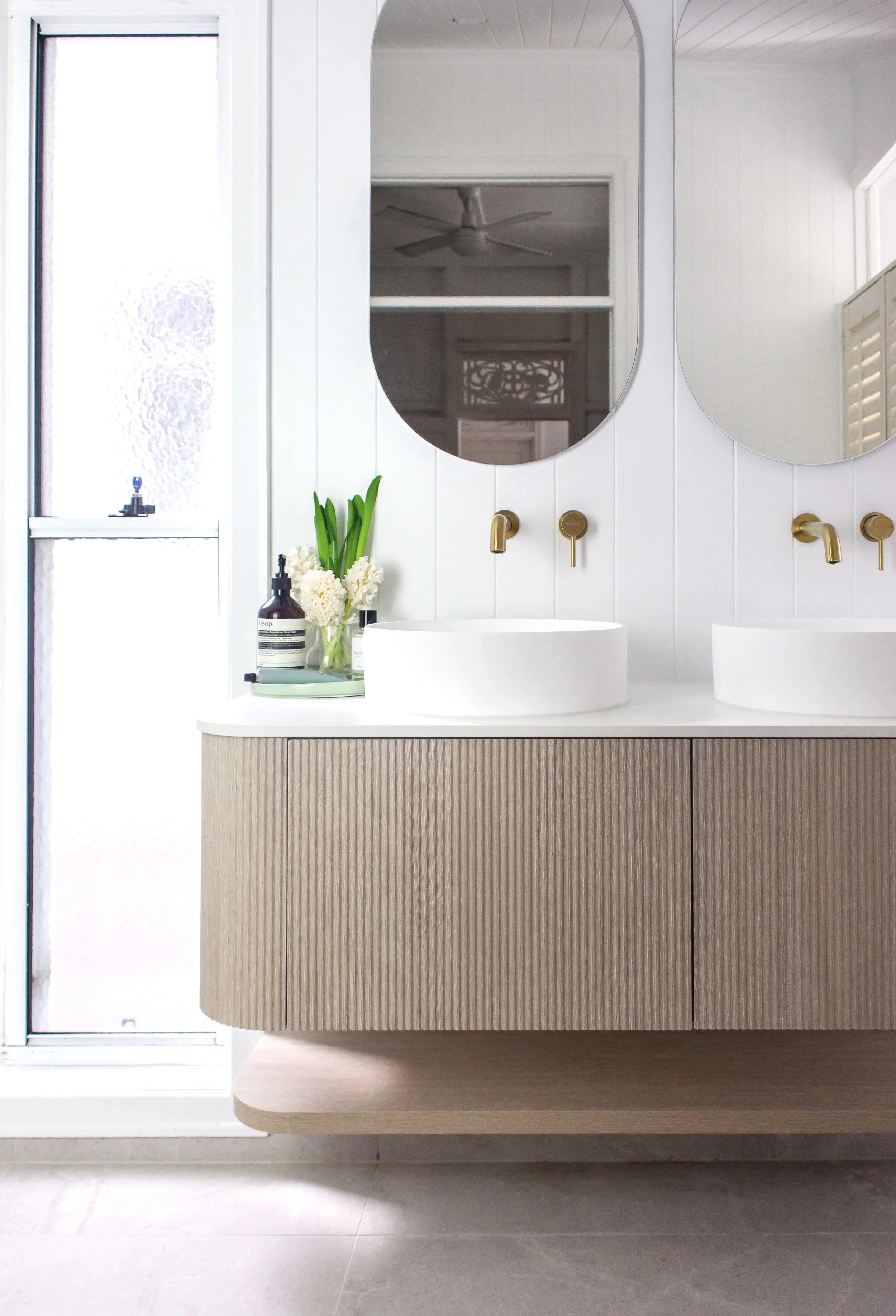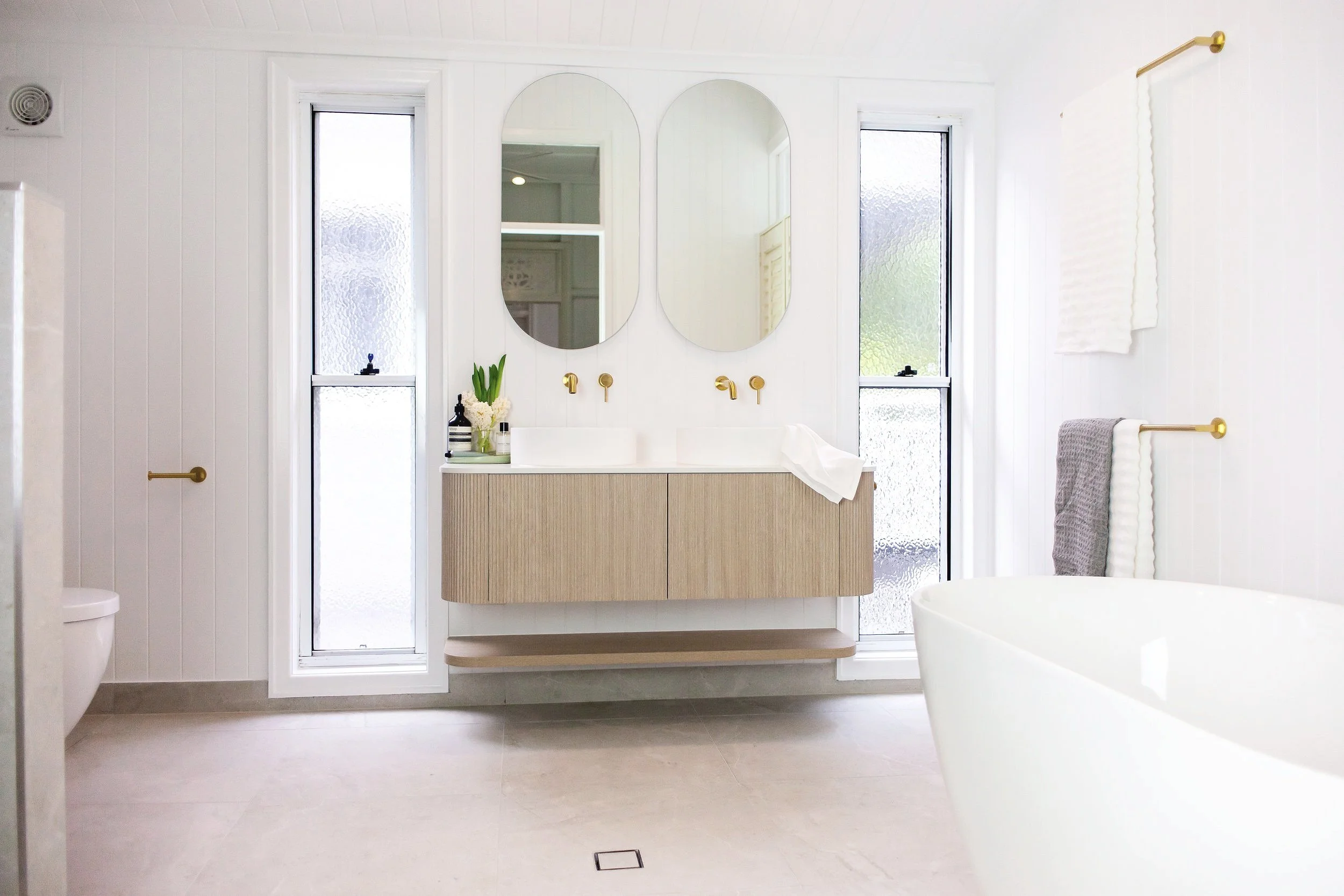 Scope: Renovation of the original post-war bathroom and ensuite, with a coastal feel, adding to the the home's Queenslander charm.